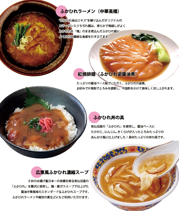 気仙沼産の「ふかひれ」を使用し、醤油ベースにたけのこ、にんじん、