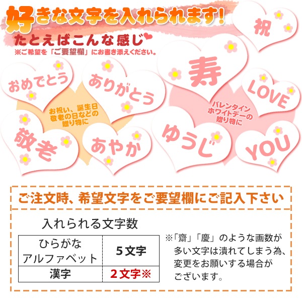 (1)文字入れについて 入れる文字に難しい漢字などが入ると対応できない場合があります。詳しくはお問合せください。 ご注文時に「ご要望欄」にお書き添えの上ご指定下さい。 (※細かい漢字や長文など、ご希望に添えない場合もあります) (2)発送について 発送まで一週間程お時間をいただきます。 (3) リボンは色が変更になる場合があります。 |