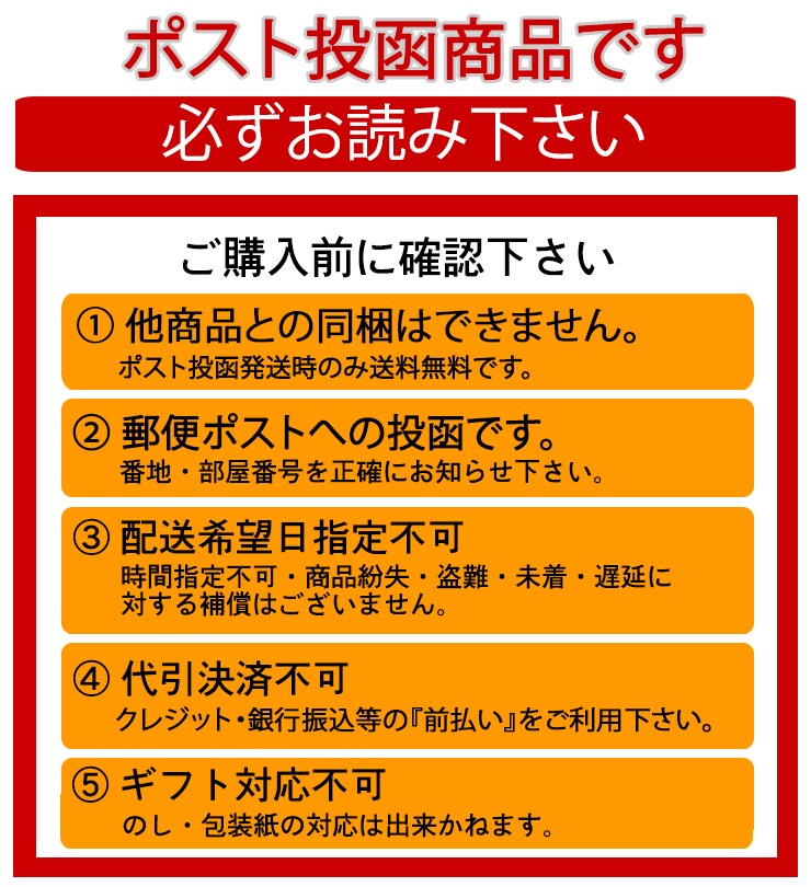 商品ページの注意書をご一読願います。ポスト投函のため、代金引換はご利用いただけません。ポスト投函のため、日時指定不可となります。発送までお時間を頂きます。