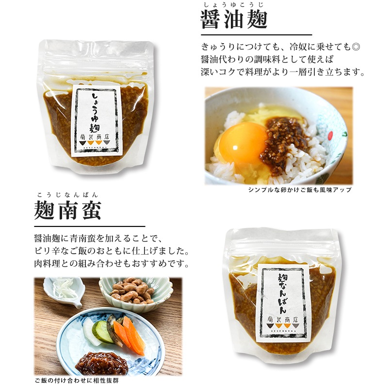 | 賞味期限 | 甘酒:製造日より20日 塩麹:製造日より2ヶ月 しょうゆ麹:製造日より3か月 こうじ南蛮:製造日より6か月 米味噌:製造日より6か月 |