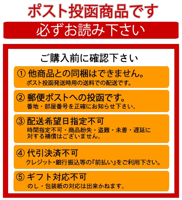 商品ページの注意書をご一読願います。ポスト投函のため、代金引換はご利用いただけません。ポスト投函のため、日時指定不可となります。
