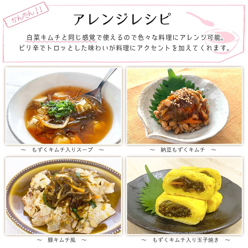 もずくの食感と、特製キムチの深みある辛味と旨味が楽しめる商品です。
